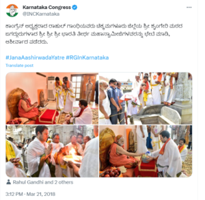 ರಾಹುಲ್ ಗಾಂಧಿ, ಸಿದ್ದರಾಮಯ್ಯನವರು ಮತ್ತು ಸಂಸದ ವೇಣುಗೋಪಾಲ್ ಸೇರಿದಂತೆ ಇತರ ಕಾಂಗ್ರೆಸ್ ಮುಖಂಡರು ಮಾರ್ಚ್, 2018ರಲ್ಲಿ ಶೃಂಗೇರಿ ಶಾರದ ಪೀಠಕ್ಕೆ ಭೇಟಿಕೊಟ್ಟು ಜಗದ್ಗುರು ಭಾರತಿ ತೀರ್ಥರನ್ನು ಭೇಟಿಯಾಗಿದ್ದರು. ಚರ್ಚೆಯ ನಂತರ ಶ್ರೀಗಳು ರಾಹುಲ್ ಮತ್ತು ಸಿದ್ದರಾಮಯ್ಯನವರಿಗೆ ಆಶೀರ್ವಾದಿಸಿದರು.ನಂತರ ರಾಹುಲ್ ಗಾಂಧಿಯವರಿಗೆ ಅವರ ತಂದೆ ರಾಜೀವ್ ಗಾಂಧಿಯವರ ಚಿತ್ರವನ್ನು ಉಡುಗೊರೆಯಾಗಿ ನೀಡಿದ್ದಾರೆ.