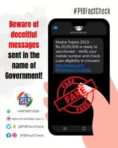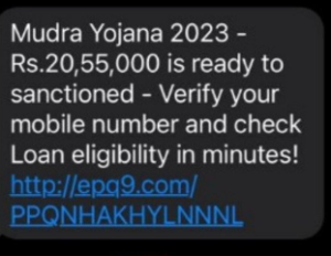 ಸುಳ್ಳು ; ಪ್ರಧಾನ ಮಂತ್ರಿ ಮುದ್ರಾ ಯೋಜನೆ ಅಡಿಯಲ್ಲಿ 20,55,000 ರೂ ಸಾಲವನ್ನು ನೀಡಲಾಗುತ್ತಿದೆ, ನಿಮ್ಮ ಮೊಬೈಲ್ಗೆ ಬಂದ ಸಂದೇಶದ ಲಿಂಕ್ ಕ್ಲಿಕ್ ಮಾಡಿ ಯೋಜನೆಯ ಲಾಭ ಪಡೆಯಿರಿ
