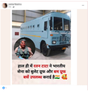 “ಇತ್ತೀಚೆಗೆ ರತನ್ ಟಾಟಾ ಅವರು ಭಾರತೀಯ ಸೇನೆಗೆ ಬುಲೆಟ್ ಮತ್ತು ಬಾಂಬ್ ಪ್ರೂಫ್ ಬಸ್ ಅನ್ನು ಉಡುಗೊರೆಯಾಗಿ ನೀಡಿದ್ದಾರೆ. ಅವರ ಈ ಕಾರ್ಯಕ್ಕೆ ಮೆಚ್ಚುಗೆ ಇರಲಿ” ಎಂಬ ಪೋಸ್ಟ್ ಸಾಮಾಜಿಕ ಜಾಲತಾಣದಲ್ಲಿ ವೈರಲ್ ಆಗುತ್ತಿದೆ. ಇದಕ್ಕೆ ಪೂರಕ ಎಂಬಂತೆ ಸಾಕಷ್ಟು ಮಂದಿ ರತನ್ ಟಾಟಾ ಅವರು ಭಾರತೀಯ ಸೇನೆಗಾಗಿ ಹಲವು ರೀತಿಯ ಉಡುಗೊರೆಯನ್ನು ನೀಡಲಿದ್ದಾರೆ ಎಂಬ ರೀತಿಯಲ್ಲಿ ಪೋಸ್ಟ್ ಮಾಡುತ್ತಿದ್ದಾರೆ.