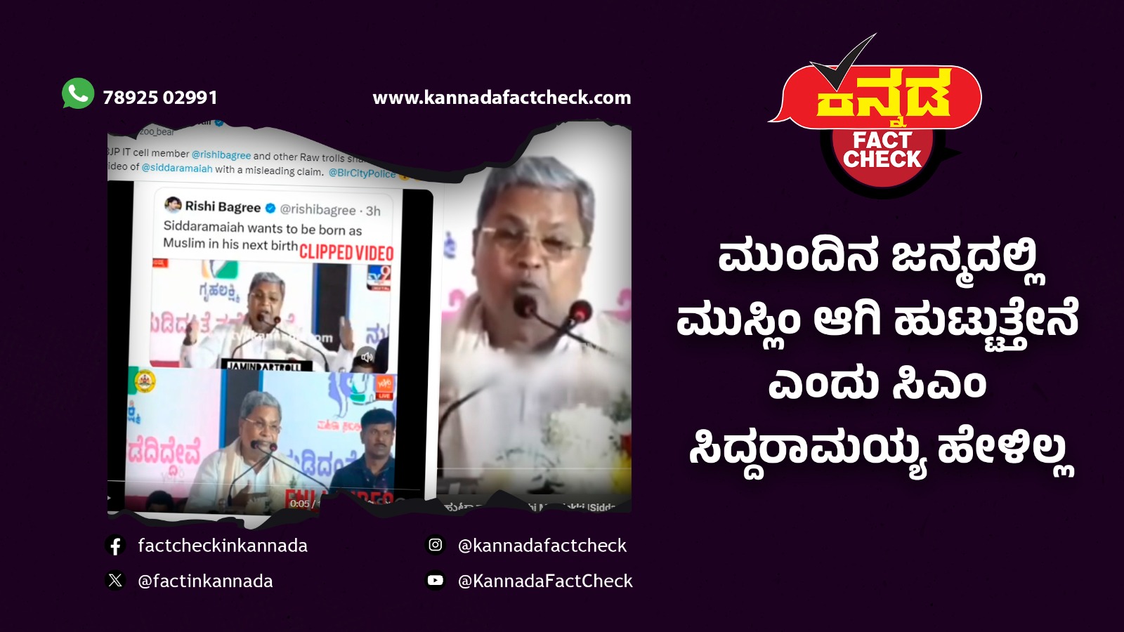 “ನಾನು ಮುಂದಿನ ಜನ್ಮ ಅಂತ ಇದ್ರೆ ಮುಸ್ಲಿಂ ಆಗಿ ಹುಟ್ಟುತ್ತೇನೆ ಎಂದು ಸಿಎಂ ಸಿದ್ದರಾಮಯ್ಯ ಹೇಳಿದ್ದಾರೆ. ಈ ವಿಡಿಯೋ ನೋಡಿ” ಎಂದು ಸಾಕಷ್ಟು ಮಂದಿ ವಿಡಿಯೋವೊಂದನ್ನ ಸಾಮಾಜಿಕ ಜಾಲತಾಣದಲ್ಲಿ ವ್ಯಾಪಕವಾಗಿ ಹಂಚಿಕೊಳ್ಳುತ್ತಿದ್ದಾರೆ. ಅದರಲ್ಲೂ ಬಿಜೆಪಿ ಐಟಿಸೆಲ್ ಸದಸ್ಯ ರಿಶಿ ಬಿಗ್ರೀ ಮತ್ತು ಹಲವು ಬಿಜೆಪಿಯ ಕಾರ್ಯಕರ್ತರು ಇದೇ ವಿಡಿಯೋವನ್ನು ಹೆಚ್ಚು ಪ್ರಚಾರ ಮಾಡಿದ್ದಾರೆ.