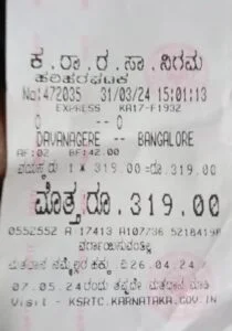 ನೀವಿಲ್ಲಿ ನೆನ್ನೆ ಅಂದರೆ 31 ಮಾರ್ಚ್ 2024ರಲ್ಲಿ ದಾವಣಗೆರೆಯಿಂದ- ಬೆಂಗಳೂರಿಗೆ ಪ್ರಯಾಣಿಸಿದ ಪ್ರಯಾಣಿಕರ ಬಸ್ ಟಿಕೆಟ್ ದರ 319 ರೂ. ಎಂದಿರುವುದನ್ನು ನೋಡಬಹುದು.