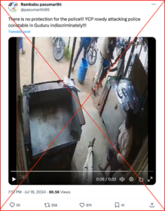“ಈ ವಿಡಿಯೋ ನೋಡಿ ಆಂಧ್ರಪ್ರದೇಶದ ಗುಡೂರಿನಲ್ಲಿ ಯುವಜನ ಶ್ರಮಿಕ ರೈತ ಕಾಂಗ್ರೆಸ್ ಪಕ್ಷದ (ವೈಎಸ್ಆರ್ಸಿಪಿ) ಕಾರ್ಯಕರ್ತರು ಪೊಲೀಸ್ ಪೇದೆಯ ಮೇಲೆ ಹಲ್ಲೆ ನಡೆಸಿದ್ದಾರೆ. ಆಂಧ್ರಪ್ರದೇಶದಲ್ಲಿ ಈಗ ಪೊಲೀಸರಿಗೂ ರಕ್ಷಣೆ ಇಲ್ಲ.” ಎಂದು ಸಾಮಾಜಿಕ ಜಾಲತಾಣದಲ್ಲಿ ವಿಡಿಯೋವೊಂದು ವ್ಯಾಪಕವಾಗಿ ವೈರಲ್ ಆಗುತ್ತಿದೆ. ಈ ವಿಡಿಯೋವನ್ನು ಹಂಚಿಕೊಂಡ ಇನ್ನೂ ಕೆಲವರು ಜಗನ್ ಮೋಹನ್ ರೆಡ್ಡಿ ಅವರ ವಿರುದ್ಧ ಕೂಡ ಆಕ್ರೋಶವನ್ನು ವ್ಯಕ್ತ ಪಡಿಸುತ್ತಿದ್ದಾರೆ.