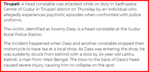 ಇದೇ ಘಟನೆಯ ಕುರಿತು ಡೆಕ್ಕನ್ ಕ್ರೋನಿಕಲ್ ಕೂಡ ವರದಿಯನ್ನು ಮಾಡಿದ್ದು, ಆ ವರದಿಯ ಪ್ರಕಾರ ದಾಳಿಕೋರ ಲಾಲ್ತು ಕಾಳಿಂದಿ ಪಶ್ಚಿಮ ಬಂಗಾಳದವರಾಗಿದ್ದು, ಸಮವಸ್ತ್ರ ಧರಿಸಿದ್ದ ಪೊಲೀಸರನ್ನು ನೋಡಿದ ಮೇಲೆ ಮಾನಸಿಕ ಅಸ್ವಸ್ತನಂತೆ ವರ್ತಿಸುತ್ತಾರೆ ಎಂದು ತಿಳಿಸಲಾಗಿದೆ. ಇನ್ನು ಹಲ್ಲೆಗೊಳಗಾದ . ಪೊಲೀಸ್ ಅಧಿಕಾರಿಯ ತಲೆಗೆ ತೀವ್ರ ಗಾಯಗಳಾಗಿದ್ದು, ಗುಡೂರು ಏರಿಯಾ ಆಸ್ಪತ್ರೆಯಲ್ಲಿ ಚಿಕಿತ್ಸೆ ನೀಡಲಾಗಿದ್ದು, ಹೆಚ್ಚಿನ ಚಿಕಿತ್ಸೆಗಾಗಿ ತಿರುಪತಿ ಜಿಲ್ಲೆಗೆ ರವಾನಿಸಲಾಗಿದೆ ಎಂಬ ಮಾಹಿತಿ ಲಭ್ಯವಾಗಿದೆ.