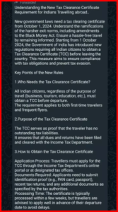 “ಅಕ್ಟೋಬರ್ 1, 2024 ರಿಂದ ವಿದೇಶಕ್ಕೆ ಪ್ರಯಾಣಿಸುವ ಮೊದಲು ಎಲ್ಲಾ ಭಾರತೀಯ ನಾಗರಿಕರು ಆದಾಯ ತೆರಿಗೆ ಕ್ಲಿಯರೆನ್ಸ್ ಪ್ರಮಾಣಪತ್ರವನ್ನು (ITCC) ಪಡೆಯಬೇಕು, ಇಲ್ಲದಿದ್ದರೆ ಯಾವುದೇ ವಿದೇಶ ಪ್ರವಾಸವನ್ನು ಕೈಗೊಳ್ಳಲು ಯಾವ ಭಾರತೀಯನಿಂದಲೂ ಸಾಧ್ಯವಾಗುವುದಿಲ್ಲ. ಒಂದು ವೇಳೆ ತೆರಿಗೆ ಕ್ಲಿಯರೆನ್ಸ್ ಪಡೆಯದೆ ವಿದೇಶ ಪ್ರವಾಸ ಮಾಡಲು ಯತ್ನಿಸಿದರೆ ಅವರಿಗೆ ಜೈಲು ಶಿಕ್ಷೆಯಾಗುವ ಸಾಧ್ಯತೆ ಇದೆ” ಎಂದು ಸಾಮಾಜಿಕ ಜಾಲತಾಣದಲ್ಲಿ ಪೋಸ್ಟ್ವೊಂದು ವೈರಲ್ ಆಗುತ್ತಿದೆ.