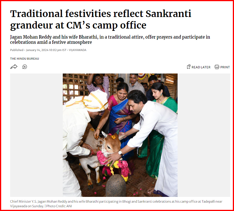 ದಿ ಹಿಂದೂ ವರದಿಯ ಪ್ರಕಾರ , ಅಂದಿನ ಮುಖ್ಯಮಂತ್ರಿ ವೈಎಸ್ ಜಗನ್ ಮೋಹನ್ ರೆಡ್ಡಿ ಮತ್ತು ಅವರ ಪತ್ನಿ ವೈಎಸ್ ಭಾರತಿ ಅವರ ಜೊತೆ 14 ಜನವರಿ 2024 ರಂದು ತಾಡೆಪಲ್ಲಿಯಲ್ಲಿರುವ ಕಚೇರಿಯಲ್ಲಿ ಸಂಕ್ರಾಂತಿ ಆಚರಣೆಯಲ್ಲಿ ಭಾಗವಹಿಸಿದ್ದರು. ದಂಪತಿಗಳು ಗೋಶಾಲೆಯಲ್ಲಿ ಹಸುಗಳನ್ನು ಪೂಜಿಸಿದರು ಎಂದು ವರದಿಯಲ್ಲಿ ಸ್ಪಷ್ಟ ಪಡಿಸಲಾಗಿದೆ. ಇದರ ಜೊತೆಗೆ ವಿನಾಯಕ, ವೆಂಕಟೇಶ್ವರ ಸ್ವಾಮಿ ಮತ್ತು ಕನಕದುರ್ಗಾ ದೇವಸ್ಥಾನಗಳಲ್ಲಿ ಪ್ರಾರ್ಥನೆ ಸಲ್ಲಿಸಿದರು ಎಂದು ಉಲ್ಲೇಖಿಸಲಾಗಿದೆ.