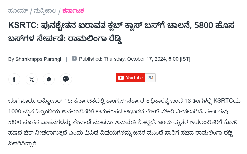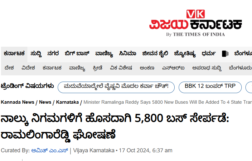 ರಾಜ್ಯ ಸರ್ಕಾರವು ಶಕ್ತಿ ಯೋಜನೆ ಘೋಷಿಸಿದ ನಂತರ ಹೊಸದಾಗಿ 5800 ಬಸ್ಗಳ ಖರೀದಿಗೆ ಅನುಮೋದನೆ ನೀಡಿದೆ ಎಂದು ಸಾರಿಗೆ ಸಚಿವರಾದ ರಾಮಲಿಂಗಾರೆಡ್ಡಿಯವರ ಘೋಷಣೆಯನ್ನು ಅಕ್ಟೋಬರ್ 17, 2024ರಂದು ಹಲವು ವಿಶ್ವಸಾರ್ಹ ಮಾಧ್ಯಮಗಳು ವರದಿ ಮಾಡಿವೆ. ಅವುಗಳನ್ನು ಇಲ್ಲಿ ಮತ್ತು ಇಲ್ಲಿ ನೋಡಬಹುದು.