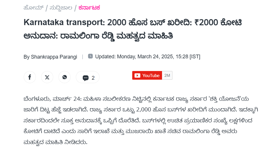 ಇನ್ನು ಮಾರ್ಚ್ 24, 2025ರಂದು ಹೊಸದಾಗಿ 2000 ಬಸ್ಗಳ ಖರೀದಿಗೆ ಸರ್ಕಾರ ಮುಂದಾಗಿದೆ, ಅದಕ್ಕಾಗಿ 2000 ಕೋಟಿ ಅನುದಾನ ನೀಡಲಾಗಿದೆ ಎಂದು ಸಾರಿಗೆ ಸಚಿವರು ಹೇಳಿರುವುದನ್ನು ಒನ್ಇಂಡಿಯಾ.ಕಾಂ ವರದಿ ಮಾಡಿದೆ. ಅದನ್ನು ಇಲ್ಲಿ ನೋಡಬಹುದು.