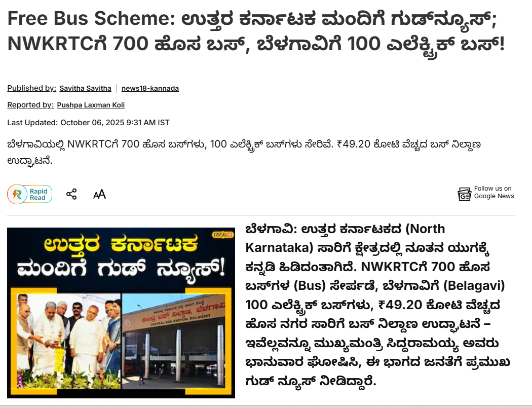 ಕಳೆದ ವಾರವಷ್ಟೇ ಅಕ್ಟೋಬರ್ 06ರಂದು ಉತ್ತರ ಕರ್ನಾಟಕದ (North Karnataka) ಸಾರಿಗೆ ಕ್ಷೇತ್ರದಲ್ಲಿ ನೂತನ ಯುಗಕ್ಕೆ ಕನ್ನಡಿ ಹಿಡಿದಂತಾಗಿದೆ. NWKRTCಗೆ 700 ಹೊಸ ಬಸ್ಗಳ (Bus) ಸೇರ್ಪಡೆ, ಬೆಳಗಾವಿಗೆ (Belagavi) 100 ಎಲೆಕ್ಟ್ರಿಕ್ ಬಸ್ಗಳು, ₹49.20 ಕೋಟಿ ವೆಚ್ಚದ ಹೊಸ ನಗರ ಸಾರಿಗೆ ಬಸ್ ನಿಲ್ದಾಣ ಉದ್ಘಾಟನೆ – ಇವೆಲ್ಲವನ್ನೂ ಮುಖ್ಯಮಂತ್ರಿ ಸಿದ್ದರಾಮಯ್ಯ ಅವರು ಭಾನುವಾರ ಘೋಷಿಸಿ, ಈ ಭಾಗದ ಜನತೆಗೆ ಪ್ರಮುಖ ಗುಡ್ ನ್ಯೂಸ್ ನೀಡಿದ್ದಾರೆ” ಎಂದು ನ್ಯೂಸ್ 18 ಕನ್ನಡ ವರದಿ ಮಾಡಿದೆ. ಅದನ್ನು ಇಲ್ಲಿ ನೋಡಬಹುದು.