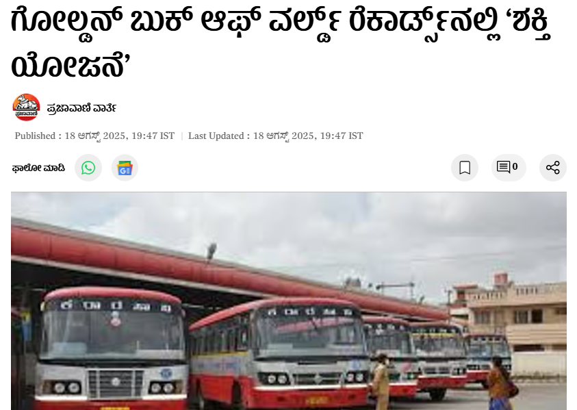 ಇಡೀ ನಾಡು ಹೆಮ್ಮೆ ಪಡುವ ಕ್ಷಣವಿದು. ನಮ್ಮ ಸರ್ಕಾರದ ಮಹತ್ವಾಕಾಂಕ್ಷೆಯ ಶಕ್ತಿ ಯೋಜನೆಯು ಪ್ರತಿಷ್ಠಿತ "Golden Book of World Records" ನಲ್ಲಿ ದಾಖಲಾಗಿ ಇತಿಹಾಸ ನಿರ್ಮಿಸಿದೆ.