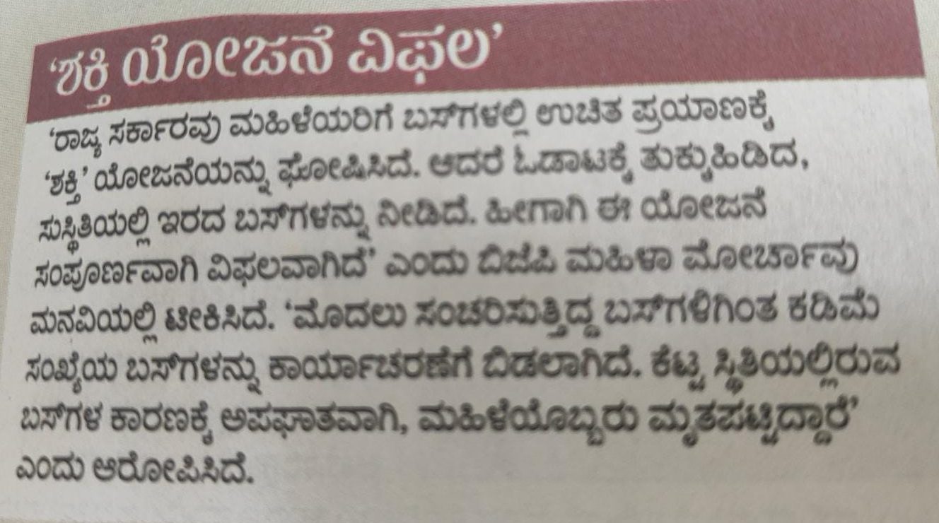 ಮಹಿಳಾ ಮೋರ್ಚಾದ ಅಧ್ಯಕ್ಷೆ ಸಿ.ಮಂಜುಳಾ ನೇತೃತ್ವದ ನಿಯೋಗವು ರಾಷ್ಟ್ರೀಯ ಮಹಿಳಾ ಆಯೋಗದ ಅಧ್ಯಕ್ಷೆ ವಿಜಯ ಕಿಶೋರ್ ರಾಹತ್ಕರ್ ಅವರನ್ನು ದೆಹಲಿಯಲ್ಲಿ ಭೇಟಿ ಮಾಡಿ ಮನವಿ ಸಲ್ಲಿಸಿದ್ದು ಅದರಲ್ಲಿ ರಾಜ್ಯದಲ್ಲಿ ಶಕ್ತಿ ಯೋಜನೆ ವಿಫಲ, ಕಡಿಮೆ ಸಂಖ್ಯೆಯ ಬಸ್ಗಳಿವೆ ಎಂದು ಆರೋಪಿಸಿದೆ. ಈ ಕುರಿತು ಪ್ರಜಾವಾಣಿ ವರದಿ ಮಾಡಿದ್ದು, “ರಾಜ್ಯ ಸರ್ಕಾರವು ಮಹಿಳೆಯರಿಗೆ ಬಸ್ಗಳಲ್ಲಿ ಉಚಿತ ಪ್ರಯಾಣಕ್ಕೆ ‘ಶಕ್ತಿ’ ಯೋಜನೆಯನ್ನು ಘೋಷಿಸಿದೆ. ಆದರೆ ಓಡಾಟಕ್ಕೆ ತುಕ್ಕುಹಿಡಿದ, ಸುಸ್ಥಿತಿಯಲ್ಲಿ ಇರದ ಬಸ್ಗಳನ್ನು ನೀಡಿದೆ. ಹೀಗಾಗಿ ಈ ಯೋಜನೆ ಸಂಪೂರ್ಣವಾಗಿ ವಿಫಲವಾಗಿದೆ’ ಎಂದು ಬಿಜೆಪಿ ಮಹಿಳಾ ಮೋರ್ಚಾವು ಮನವಿಯಲ್ಲಿ ಟೀಕಿಸಿದೆ. ‘ಮೊದಲು ಸಂಚರಿಸುತ್ತಿದ್ದ ಬಸ್ಗಳಿಗಿಂತ ಕಡಿಮೆ ಸಂಖ್ಯೆಯ ಬಸ್ಗಳನ್ನು ಕಾರ್ಯಾಚರಣೆಗೆ ಬಿಡಲಾಗಿದೆ. ಕೆಟ್ಟ ಸ್ಥಿತಿಯಲ್ಲಿರುವ ಬಸ್ಗಳ ಕಾರಣಕ್ಕೆ ಅಪಘಾತವಾಗಿ, ಮಹಿಳೆಯೊಬ್ಬರು ಮೃತಪಟ್ಟಿದ್ದಾರೆ’ ಎಂದು ಆರೋಪಿಸಿದೆ” ಎಂದು ವರದಿಯಲ್ಲಿ ಹೇಳಲಾಗಿದೆ. ಇದು ನಿಜವೇ ಎಂಬುದನ್ನು ಪರಿಶೀಲಿಸೋಣ.