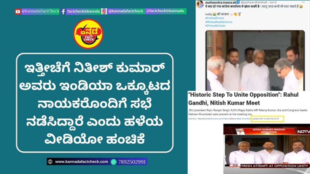 ಆದ್ದರಿಂದ, ನಿತೀಶ್ ಕುಮಾರ್ ಅವರು ಇಂಡಿಯಾ ಒಕ್ಕೂಟದ ನಾಯಕರೊಂದಿಗಿನ ಹಳೆಯ ವೀಡಿಯೋವನ್ನು ಇತ್ತೀಚಿಗೆ ಸಭೆ ನಡೆಸಿದ್ದಾರೆ ಎಂದು ತಪ್ಪಾಗಿ ಹಂಚಿಕೊಳ್ಳಲಾಗಿದೆ.