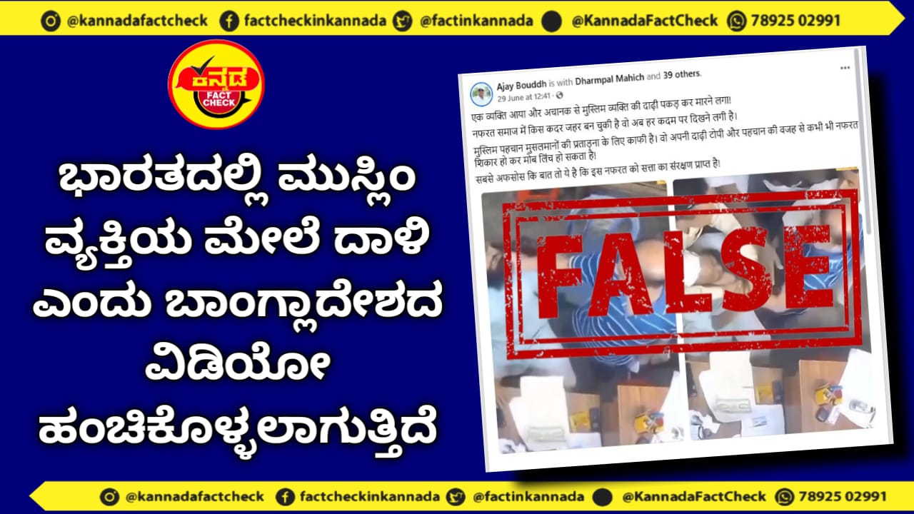 ಸಾಮಾಜಿಕ ಮಾಧ್ಯಮದಲ್ಲಿ ಮುಸ್ಲಿಂ ವ್ಯಕ್ತಿಯೊಬ್ಬನ ವಿಡಿಯೋ ಹೆಚ್ಚು ವೈರಲ್ ಆಗುತ್ತಿದೆ. ವಿಡಿಯೋದಲ್ಲಿ, ಮುಸ್ಲಿಂ ವ್ಯಕ್ತಿ ಕುರ್ಚಿಯ ಮೇಲೆ ಕುಳಿತಿರುವುದನ್ನು ಕಾಣಬಹುದು ಮತ್ತು ಒಬ್ಬ ವ್ಯಕ್ತಿ ಬಂದು ಅವನ ಗಡ್ಡವನ್ನು ಎಳೆದು ಹೊಡೆಯಲು ಪ್ರಾರಂಭಿಸುತ್ತಾನೆ. ಈ ವಿಡಿಯೋ ಹಂಚಿಕೊಂಡಿರುವ ಹಲವರು ಈ ಘಟನೆ ಭಾರತದಲ್ಲಿ ನಡೆದಿದೆ, ಹಲ್ಲೆ ಮಾಡಿದವರು ಹಿಂದೂ ವ್ಯಕ್ತಿ ಭಾರತದಲ್ಲಿ ಅಲ್ಪ ಸಂಖ್ಯಾತರು ಭಯದಿಂದ ಬದುಕುತ್ತಿದ್ದಾರೆ ಎಂದು ಭಾರತದ ವಿರುದ್ಧ ಹಲವು ಕಿಡಿಗೇಡಿಗಳು ಪೋಸ್ಟ್ಗಳನ್ನು ಹಂಚಿಕೊಳ್ಳುತ್ತಿದ್ದಾರೆ.