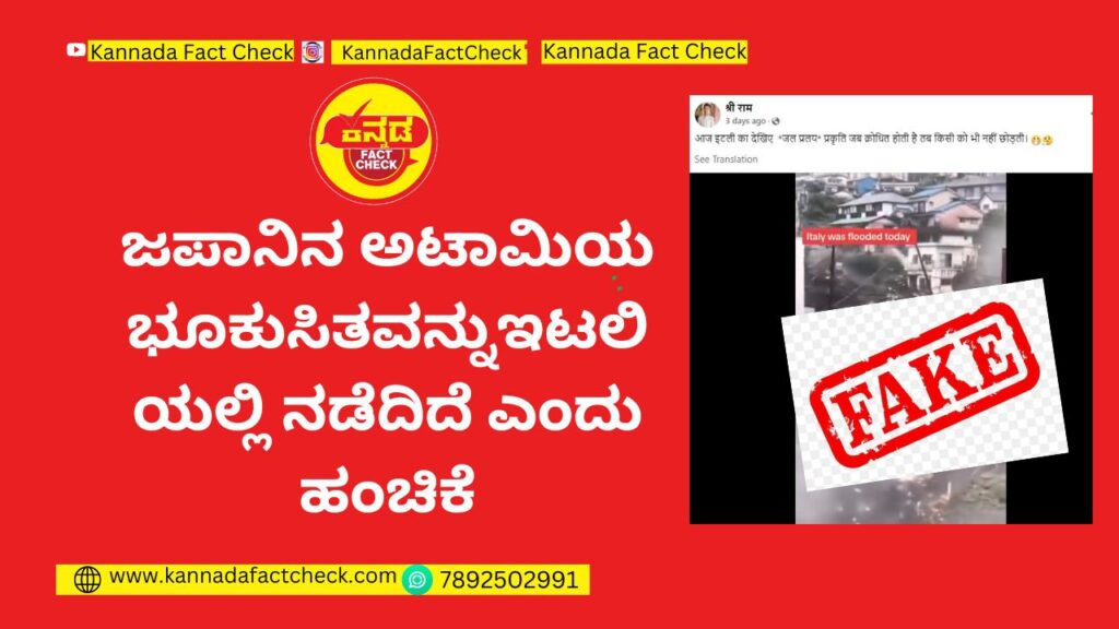 ವೈರಲ್ ವೀಡಿಯೊವನ್ನುYoutube ಚಾನೆಲ್ VLOGAMESPORTS ಟಿವಿಯಲ್ಲಿ ಹಂಚಿಕೊಂಡಿದೆ. 2021ರ ಜುಲೈ 3ರಂದು ಶೀರ್ಷಿಕೆಯೊಂದಿಗೆ: “ಶಿಜುವೊಕಾ ಜಪಾನ್ನ ಅಟಾಮಿ ನಗರದಲ್ಲಿ ಬೆಳಿಗ್ಗೆ ಭೂ ಕುಸಿತ ಉಂಟಾಗಿ ಸುಮಾರು 20 ಜನರು ಕಾಣೆಯಾಗಿದ್ದಾರೆ ಎಂದು ಹಂಚಿಕೊಳ್ಳಲಾಗಿದೆ”. ಆದ್ದರಿಂದ ಈ ವೀಡಿಯೊ ಹಳೆಯದು. ಇದು ಇಟಲಿಯಲ್ಲಿ ಪ್ರಸ್ತುತ ಪ್ರವಾಹ ಉಂಟಾಗಿ ಭೂ ಕುಸಿತ ಸಂಬಂಧಿಸಿಲ್ಲ ಎಂದು ಖಚಿತಪಡಿಸಿದೆ.