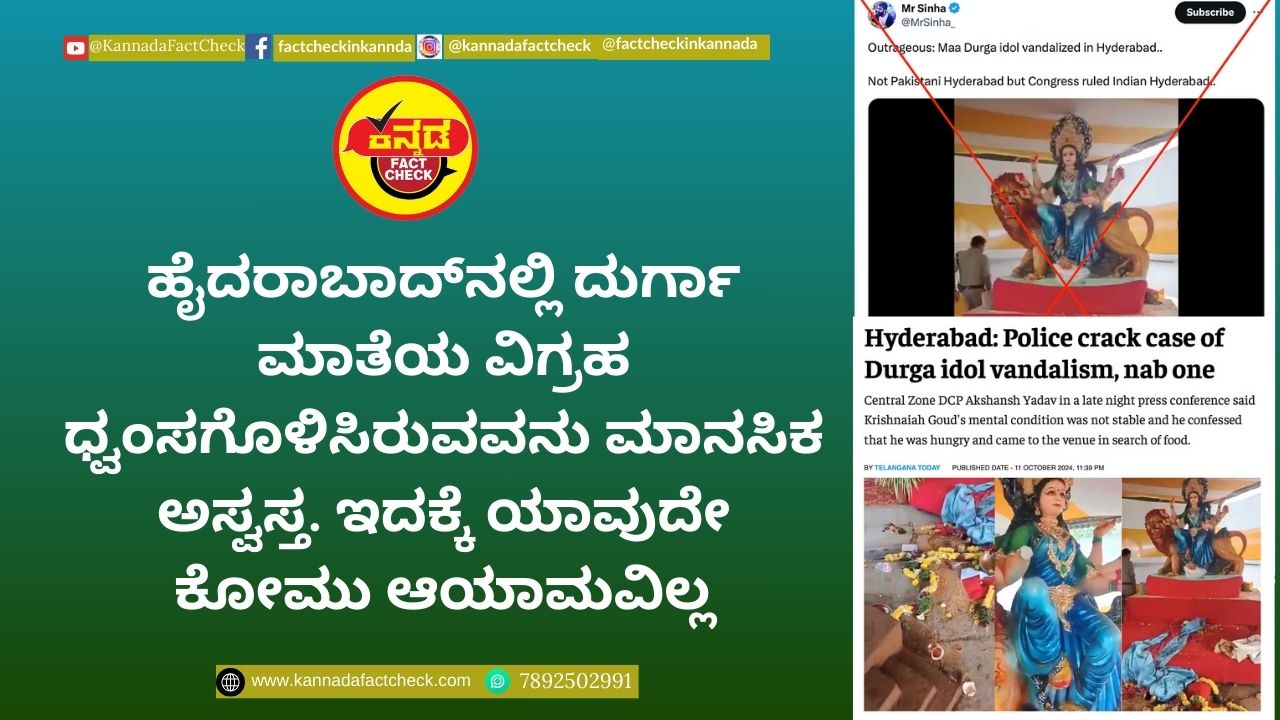 ಈ ವಿಡಿಯೋವನ್ನು”ಅತಿರೇಕ: ಹೈದರಾಬಾದ್ನಲ್ಲಿ ದುರ್ಗಾ ಮಾತೆಯ ವಿಗ್ರಹವನ್ನು ಧ್ವಂಸಗೊಳಿಸಲಾಗಿದೆ. ಪಾಕಿಸ್ತಾನಿ ಹೈದರಾಬಾದ್ ಅಲ್ಲ, ಕಾಂಗ್ರೆಸ್ ಆಡಳಿತದ ಭಾರತೀಯ ಹೈದರಾಬಾದ್” ಎಂದು ಕೆಲವು ಬಿಜೆಪಿ ಬೆಂಬಲಿಗರು ಹಂಚಿಕೊಳ್ಳುತ್ತಿದ್ದಾರೆ.