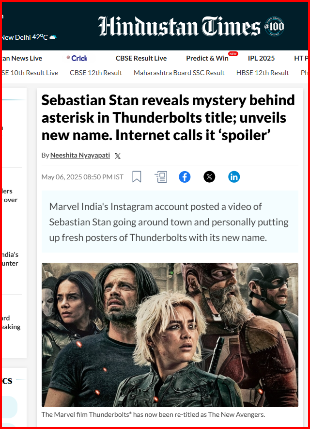 ಈ ಬಗ್ಗೆ ಇನ್ನಷ್ಟು ಹುಡುಕಾಟವನ್ನು ನಡೆಸಿದಾಗ 6 ಮೇ 2025ರಂದು ಹಿಂದೂಸ್ತಾನ್ ಟೈಮ್ಸ್ ಈ ಕುರಿತು ವರದಿ ಪ್ರಕಟಿಸಿರುವುದು ಕಂಡು ಬಂದಿದೆ. ಮಾರ್ವೆಲ್ ಇಂಡಿಯಾದ ಇನ್ಸ್ಟಾಗ್ರಾಮ್ ಖಾತೆಯು ಸೆಬಾಸ್ಟಿಯನ್ ಸ್ಟಾನ್ ವಿವಿಧ ನಗರಗಳನ್ನು ಸುತ್ತುತ್ತಿರುವ ಮತ್ತು ‘ದಿ ನ್ಯೂ ಅವೆಂಜರ್ಸ್’ ಎಂಬ ಹೊಸ ಹೆಸರಿನೊಂದಿಗೆ ಥಂಡರ್ಬೋಲ್ಟ್ಗಳ* ಹೊಸ ಪೋಸ್ಟರ್ಗಳನ್ನು ವೈಯಕ್ತಿಕವಾಗಿ ಹಾಕುತ್ತಿರುವ ವೀಡಿಯೊವನ್ನು ಪೋಸ್ಟ್ ಮಾಡಿದೆ. ವರದಿಯ ಶೀರ್ಷಿಕೆ, “ಥಂಡರ್ಬೋಲ್ಟ್ಗಳ ಶೀರ್ಷಿಕೆಯಲ್ಲಿ ನಕ್ಷತ್ರ ಚಿಹ್ನೆಯ ಹಿಂದಿನ ರಹಸ್ಯವನ್ನು ಸೆಬಾಸ್ಟಿಯನ್ ಸ್ಟಾನ್ ಬಹಿರಂಗಪಡಿಸುತ್ತಾರೆ; ಹೊಸ ಹೆಸರನ್ನು ಅನಾವರಣಗೊಳಿಸುತ್ತಾರೆ. ಇಂಟರ್ನೆಟ್ ಇದನ್ನು ‘ಸ್ಪಾಯ್ಲರ್’ ಎಂದು ಕರೆಯುತ್ತಿದೆ.” ಎಂದು ಉಲ್ಲೇಖಿಸಿರುವುದು ಕಂಡು ಬಂದಿದೆ. ಈ ಮೂಲಕ ವೈರಲ್ ವಿಡಿಯೋ ಮಾರ್ವೆಲ್ನ ಥಂಡರ್ಬೋರ್ಲ್ಸ್ಡ್ ಚಿತ್ರಕ್ಕೆ ಸಂಬಂಧಿಸಿದ್ದು, ಇದನ್ನು ಎಡಿಟ್ ಮಾಡಿ ಹಂಚಿಕೊಳ್ಳುತ್ತಿರುವುದು ಸ್ಪಷ್ಟವಾಗಿದೆ.