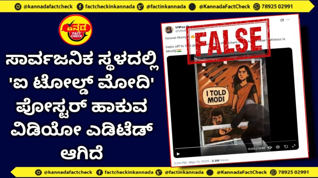 ಭಾರತ ಮತ್ತು ಪಾಕಿಸ್ತಾನ ನಡುವೆ ನಡೆಯುತ್ತಿರುವ ಗಡಿ ಭದ್ರತಾ ಉದ್ವಿಗ್ನತೆಯ ನಡುವೆ, ಸಾರ್ವಜನಿಕ ಸ್ಥಳದಲ್ಲಿ ಪೋಸ್ಟರ್ನ ವೀಡಿಯೊವೊಂದು X ಸೇರಿದಂತೆ ಸಾಮಾಜಿಕ ಜಾಲತಾಣಗಳಲ್ಲಿ ವೈರಲ್ ಆಗಿದೆ. ಈ ವಿಡಿಯೋದಲ್ಲಿ ಕಪ್ಪು ಬಟ್ಟೆ ಧರಿಸಿದ ವ್ಯಕ್ತಿಯೊಬ್ಬ ಬಸ್ ನಿಲ್ದಾಣದಲ್ಲಿ ಈಗಿರುವ ಪೋಸ್ಟರ್ ಮೇಲೆ ಹೊಸ ಪೋಸ್ಟರ್ ಅನ್ನು ಹಾಕುತ್ತಿರುವುದನ್ನು ಕಾಣಬಹುದು. ಮೂಲ ಪೋಸ್ಟರ್ನಲ್ಲಿ ಉಗ್ರನೊಬ್ಬ ‘ಮೋದಿಗೆ ಹೇಳು’ ಎಂಬ ಪಠ್ಯದೊಂದಿಗೆ ವ್ಯಂಗ್ಯಚಿತ್ರದ ಚಿತ್ರವಿದ್ದರೆ, ಹೊಸ ಪೋಸ್ಟರ್ನಲ್ಲಿ ‘I told Modi’ (ನಾನು ಮೋದಿಗೆ ಹೇಳಿದೆ) ಎಂದು ಬರೆಯಲಾಗಿದೆ.