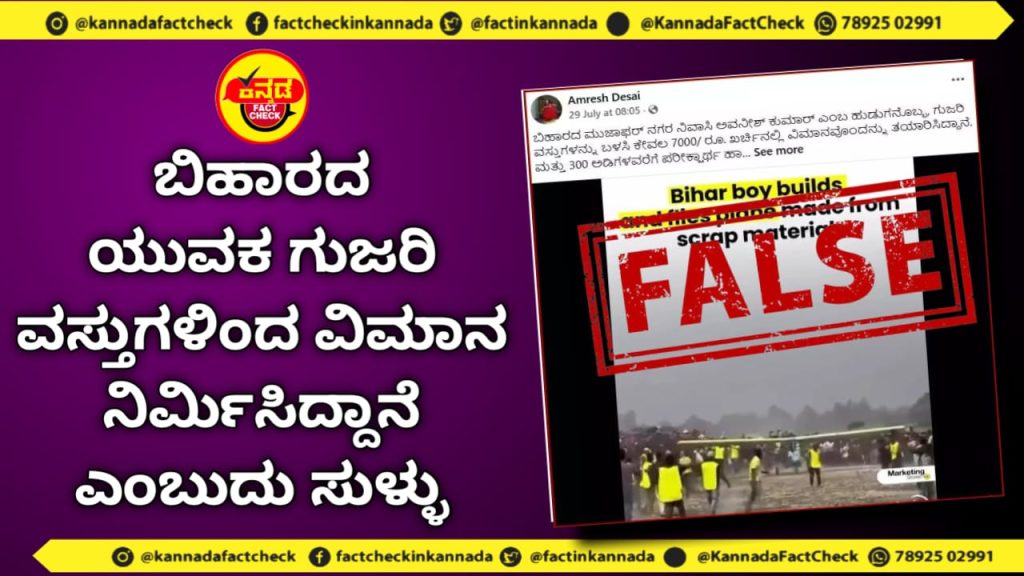 ಬಿಹಾರದ ಮುಜಫರ್ಪುರದ ಅವನೀಶ್ ಕುಮಾರ್ ಎಂಬ ಯುವಕ ಕೇವಲ 7,000 ರೂಪಾಯಿ ವೆಚ್ಚದಲ್ಲಿ ಸ್ಕ್ರ್ಯಾಪ್ ವಸ್ತುಗಳನ್ನು ಬಳಸಿ ವಿಮಾನವೊಂದನ್ನು ರಚಿಸಿದ್ದಾನೆ ಎಂಬ ವೀಡಿಯೊ ಆನ್ಲೈನ್ನಲ್ಲಿ ಭಾರೀ ವೈರಲ್ ಆಗುತ್ತಿದೆ. ಈ ವೀಡಿಯೊದಲ್ಲಿ ಒಂದು ಸಣ್ಣ ವಿಮಾನವು ಭೂಮಿಯಿಂದ ಮೇಲಕ್ಕೆ ಏರುವ ದೃಶ್ಯವನ್ನು ನೋಡಬಹುದು.