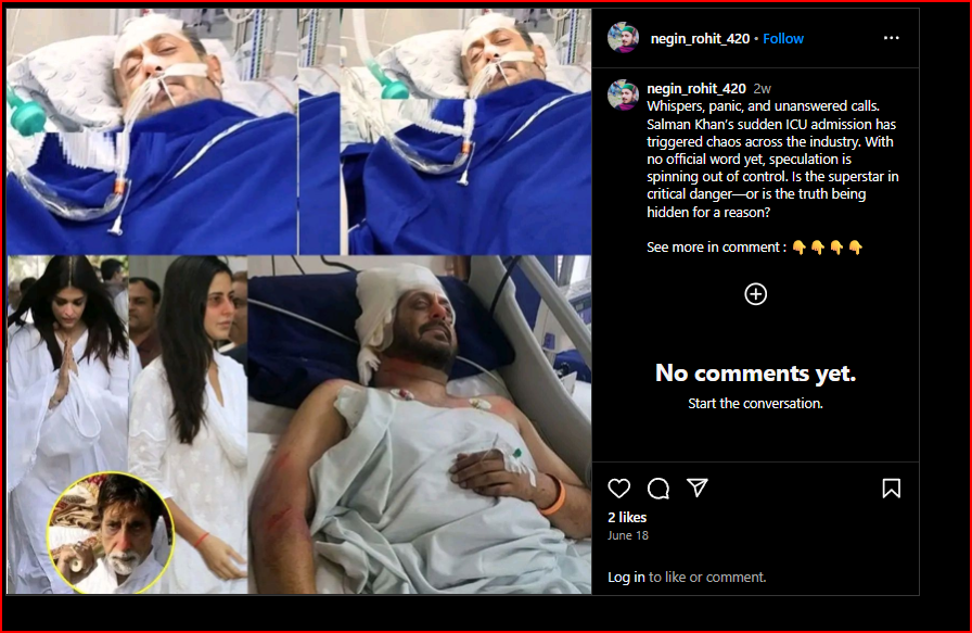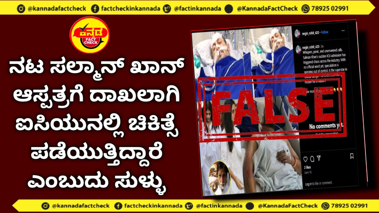 ಇನ್ನೂ ಕೆಲವರು ಸಲ್ಮಾನ್ ಖಾನ್ ಅವರಿಗೆ ಐಸಿಯುನಲ್ಲಿ ಚಿಕಿತ್ಸೆ ನೀಡಲಾಗುತ್ತಿದೆ. ಅವರು ತೀವ್ರ ಸ್ವರೂಪದ ಆರೋಗ್ಯ ಸಮಸ್ಯೆಗೆ ಒಳಗಾಗಿದ್ದು, ಅವರನ್ನು ಉಳಿಸಿಕೊಳ್ಳುವುದು ಕಷ್ಟ ಎಂಬ ಮಾತುಗಳು ಕೇಳಿ ಬರುತ್ತಿವೆ ಎಂದು ಬರೆದುಕೊಂಡಿದ್ದಾರೆ. ಹೀಗಾಗಿ ಇದು ವಿವಿಧ ಆಯಾಮಗಳಲ್ಲಿ ಹಂಚಿಕೊಳ್ಳಲಾಗುತ್ತಿದ್ದು, ಹಲವರು ಇದನ್ನು ಸುಳ್ಳು ಎಂದು ಕೂಡ ಪ್ರತಿಪಾದಿಸುತ್ತಿದ್ದಾರೆ. ಹೀಗೆ ವ್ಯಾಪಕವಾಗಿ ಹಂಚಿಕೊಳ್ಳಲಾಗುತ್ತಿರುವ ವೈರಲ್ ಫೋಟೊವಿನ ನಿಜಾಂಶ ಏನು ಎಂಬುದನ್ನು ಈ ಫ್ಯಾಕ್ಟ್ಚೆಕ್ನಲ್ಲಿ ಪರಿಶೀಲನೆ ನಡೆಸೋಣ