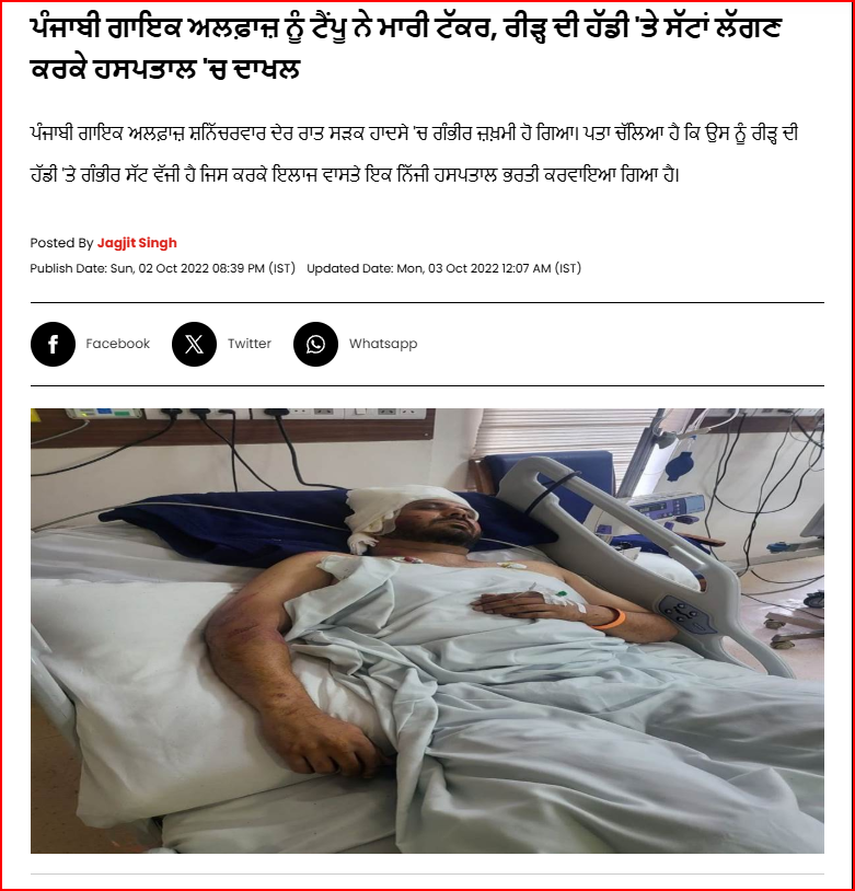 ಇನ್ನು ಎರಡನೇ ಫೋಟೋದ ಕುರಿತು ಪರಿಶೀಲನೆ ನಡೆಸಲು ಮುಂದಾಗಿ ಗೂಗಲ್ ರಿವರ್ಸ್ ಇಮೇಜ್ನಲ್ಲಿ ಹುಡುಕಾಟವನ್ನು ನಡೆಸಿದಾಗ, ಪಂಜಾಬಿ ಜಾಗರಣ ವೆಬ್ಸೈಟ್ನಲ್ಲಿ ವೈರಲ್ ಚಿತ್ರಕ್ಕೆ ಸಂಬಂಧಿಸಿದ ಸುದ್ದಿ ಲಭ್ಯವಾಗಿದೆ. ಇದನ್ನು 2 ಅಕ್ಟೋಬರ್ 2022 ರಂದು ಪ್ರಕಟಿಸಲಾಗಿದೆ ಇದರಲ್ಲಿ ನೀಡಿರುವ ಮಾಹಿತಿಯ ಪ್ರಕಾರ, ಪಂಜಾಬಿ ಗಾಯಕ ಅಲ್ಪಾಜ್ ಕಾರಿನಲ್ಲಿ ಪೆಟ್ರೋಲ್ ತುಂಬಲು ನಿಂತಾಗ ಆ ಸಮಯದಲ್ಲಿ ಅಪರಿಚಿತ ಟೆಂಪೋ ಚಾಲಕನೊಬ್ಬ ಅವರಿಗೆ ಡಿಕ್ಕಿ ಹೊಡೆದಿದ್ದಾನೆ. ಬಳಿಕ ಅವರನ್ನು ಆಸ್ಪತ್ರೆಗೆ ಸೇರಿಸಲಾಗಿದೆ. ವೈರಲ್ ಚಿತ್ರವು ಅವರನ್ನು ಆಸ್ಪತ್ರೆಗೆ ಸೇರಿಸಿದ ಸಮಯದಾಗಿದೆ ಎಂದು ಬರೆಯಲಾಗಿದೆ. ಹೀಗಾಗಿ ಈ ಎರಡು ವೈರಲ್ ಫೋಟೋಗಳು ಸಲ್ಮಾನ್ ಖಾನ್ ಅವರದ್ದು ಅಲ್ಲ ಎಂಬುದು ಸ್ಪಷ್ಟವಾಗಿದೆ.