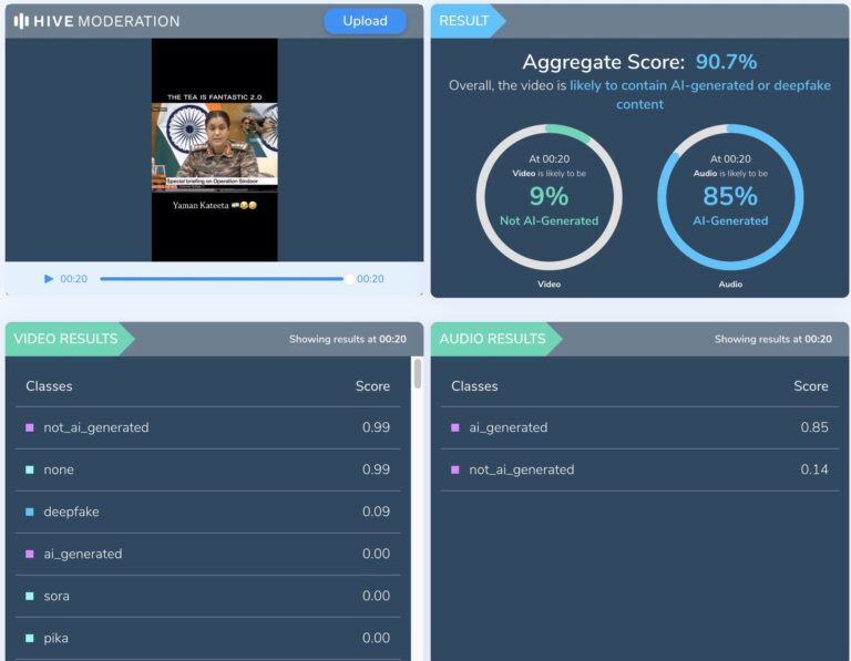 ನಂತರ ನಾವು ಈ ವೈರಲ್ ವೀಡಿಯೊವನ್ನು ಹೈವ್ ಮಾಡರೇಶನ್ ಮೂಲಕ ನಡೆಸಿದ್ದೇವೆ , ಇದು AI ವಿಷಯ ಪತ್ತೆ ಸಾಧನವಾಗಿದ್ದು, ಇದು 90% ವಿಶ್ವಾಸದೊಂದಿಗೆ ವೀಡಿಯೊವು ಡೀಪ್ಫೇಕ್ ಅಥವಾ AI-ರಚಿತ ವಿಷಯವನ್ನು ಹೊಂದಿದೆ ಎಂದು ಸೂಚಿಸುತ್ತದೆವರದಿಯ ಪ್ರಕಾರ, ಆಡಿಯೊವನ್ನು ಕೃತಕ ಬುದ್ಧಿಮತ್ತೆಯನ್ನು ಬಳಸಿಕೊಂಡು ರಚಿಸಲಾದ ಸಾಧ್ಯತೆ 85% ಎಂದು ಗುರುತಿಸಲಾಗಿದೆ. ಈ ಎಲ್ಲಾ ಮಾಹಿತಿಯ ಆಧಾರದ ಮೇಲೆ, ವೈರಲ್ ವೀಡಿಯೊ ಡೀಪ್ಫೇಕ್ ಎಂದು ಸ್ಪಷ್ಟವಾಗುತ್ತದೆ.