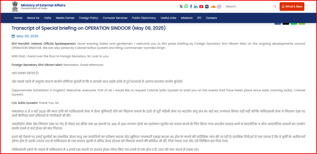 ಸಾಮಾಜಿಕ ಜಾಲತಾಣಗಳಲ್ಲಿ ವ್ಯಾಪಕವಾಗಿ ಹಂಚಿಕೊಳ್ಳಲಾಗುತ್ತಿರುವ ವೈರಲ್ ವಿಡಿಯೋ ಕುರಿತು ಪರಿಶೀಲನೆ ನಡೆಸಲು ನಮ್ಮ ಕನ್ನಡ ಫ್ಯಾಕ್ಟ್ಚೆಕ್ ತಂಡ ಮುಂದಾಯಿತು. ಇದಕ್ಕಾಗಿ ನಾವು ವೈರಲ್ ವಿಡಿಯೋವಿನ ಕೆಲವೊಂದು ಕೀ ಫ್ರೇಮ್ಗಳನ್ನು ಬಳಸಿಕೊಂಡು ಗೂಗಲ್ ರಿವರ್ಸ್ ಇಮೇಜ್ನಲ್ಲಿ ಹುಡುಕಾಟವನ್ನು ನಡೆಸಿದೆವು. ಈ ವೇಳೆ ನಮಗೆ ಸೋಫಿಯಾ ಖುರೇಷಿ ಅವರನ್ನು ತೋರಿಸುವ ಕ್ಲಿಪ್ ಅನ್ನು ಮೇ 09, 2025 ರಂದು ನಡೆದ ‘ಆಪರೇಷನ್ ಸಿಂಧೂರ್’ ಕುರಿತು ಭಾರತದ ವಿದೇಶಾಂಗ ಸಚಿವಾಲಯದ ಪತ್ರಿಕಾಗೋಷ್ಠಿಯಿಂದ ತೆಗೆದುಕೊಳ್ಳಲಾಗಿದೆ ಎಂದು ನಾವು ಕಂಡುಕೊಂಡಿದ್ದೇವೆ ̤ ಈ ಬ್ರೀಫಿಂಗ್ನಲ್ಲಿ, ಕರ್ನಲ್ ಖುರೇಷಿ, ಮೇ 07–08, 2025 ರ ರಾತ್ರಿ, ಪಾಕಿಸ್ತಾನಿ ಸೇನೆಯು ಪಶ್ಚಿಮ ಗಡಿಯಲ್ಲಿ ಭಾರತೀಯ ವಾಯುಪ್ರದೇಶವನ್ನು ಪದೇ ಪದೇ ಉಲ್ಲಂಘಿಸಿ, ಪ್ರಮುಖ ಮಿಲಿಟರಿ ಮೂಲಸೌಕರ್ಯಗಳನ್ನು ಗುರಿಯಾಗಿಸಿಕೊಂಡು ಹೇಗೆ ಮತ್ತು ಭಾರತೀಯ ಸಶಸ್ತ್ರ ಪಡೆಗಳು ದಾಳಿಗಳ ವಿರುದ್ಧ ಯಶಸ್ವಿಯಾಗಿ ಪ್ರತೀಕಾರ ತೀರಿಸಿಕೊಂಡವು ಎಂಬುದನ್ನು ವಿವರಿಸಿರುವುದು ಕಂಡು ಬಂದಿದೆ.