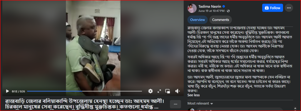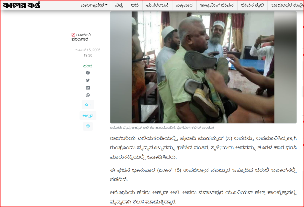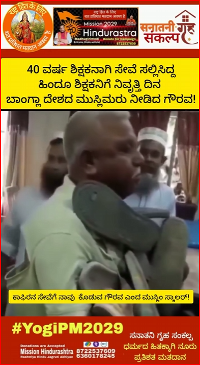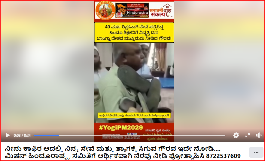 “40ವರ್ಷ ಶಿಕ್ಷಕನಾಗಿ ಸೇವೆ ಸಲ್ಲಿಸಿದ ಹಿಂದೂ ಶಿಕ್ಷಕನಿಗೆ ನಿವೃತ್ತಿಯ ದಿನ ಬಾಂಗ್ಲಾದೇಶದ ಮುಸ್ಲಿಮರು ನೀಡಿದ ಗೌರವ. ಕಾಫಿರನ ಸೇವೆಗೆ ನಾವು ಕೊಡುವ ಗೌರವ ಎಂದ ಮುಸ್ಲಿಂ ಸ್ಕಾಲರ್” ಎಂದು ವಿಡಿಯೋ ಒಂದನ್ನು ಸಾಮಾಜಿಕ ಜಾಲತಾಣದಲ್ಲಿ ವ್ಯಾಪಕವಾಗಿ ಹಂಚಿಕೊಳ್ಳಲಾಗುತ್ತಿದೆ. ಇದರಲ್ಲಿ ವ್ಯಕ್ತಿಯೊಬ್ಬನ ಕುತ್ತಿಗೆಗೆ ಚಪ್ಪಲಿ ಹಾರ ಹಾಕಿರುವುದು ಕಂಡುಬಂದಿದೆ.