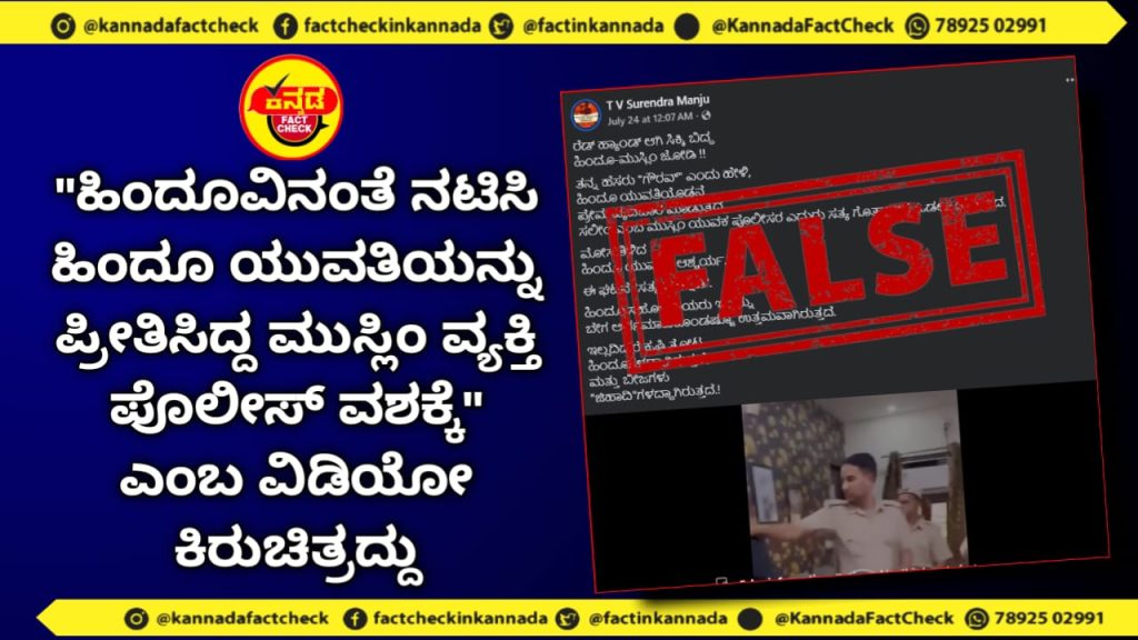 ಸಾಮಾಜಿಕ ಮಾಧ್ಯಮಗಳಲ್ಲಿ ಒಂದು ವೀಡಿಯೊ ವೈರಲ್ ಆಗುತ್ತಿದೆ. ಅದರಲ್ಲಿ ನೀಲಿ ಶರ್ಟ್ ಧರಿಸಿದ ವ್ಯಕ್ತಿಯೊಬ್ಬ ಪೊಲೀಸರಿಂದ ತಪ್ಪಿಸಿಕೊಂಡು ಮನೆಯಿಂದ ಓಡಿಹೋಗಲು ಯತ್ನಿಸುತ್ತಾನೆ. ಆದರೆ, ಪೊಲೀಸರು ಆತನ ಕಾಲರ್ ಹಿಡಿದು ಸೋಫಾದ ಮೇಲೆ ಕೂರಿಸುತ್ತಾರೆ. ವೀಡಿಯೊದಲ್ಲಿ ಪೊಲೀಸರ ಜೊತೆಗೆ ಬಿಳಿ ಶರ್ಟ್ ಧರಿಸಿದ ವ್ಯಕ್ತಿ ಮತ್ತು ನೀಲಿ ಕುರ್ತಾ ಧರಿಸಿದ ಮಹಿಳೆಯೂ ಕಾಣಿಸುತ್ತಾರೆ. ಹಲವು ಬಳಕೆದಾರರು ಈ ವೀಡಿಯೊವನ್ನು ಹಂಚಿಕೊಂಡು, ಹಿಂದೂ ಹೆಸರು ಹೇಳಿಕೊಂಡು ಹಿಂದೂ ಹುಡುಗಿಯನ್ನು ಪ್ರೀತಿಸುತ್ತಿದ್ದ ಮುಸ್ಲಿಂ ವ್ಯಕ್ತಿಯೊಬ್ಬ ಪೊಲೀಸರ ಕೈಗೆ ಸಿಕ್ಕಿಬಿದ್ದಿದ್ದಾನೆ ಎಂದು ಹಂಚಿಕೊಳ್ಳುತ್ತಿದ್ದಾರೆ.